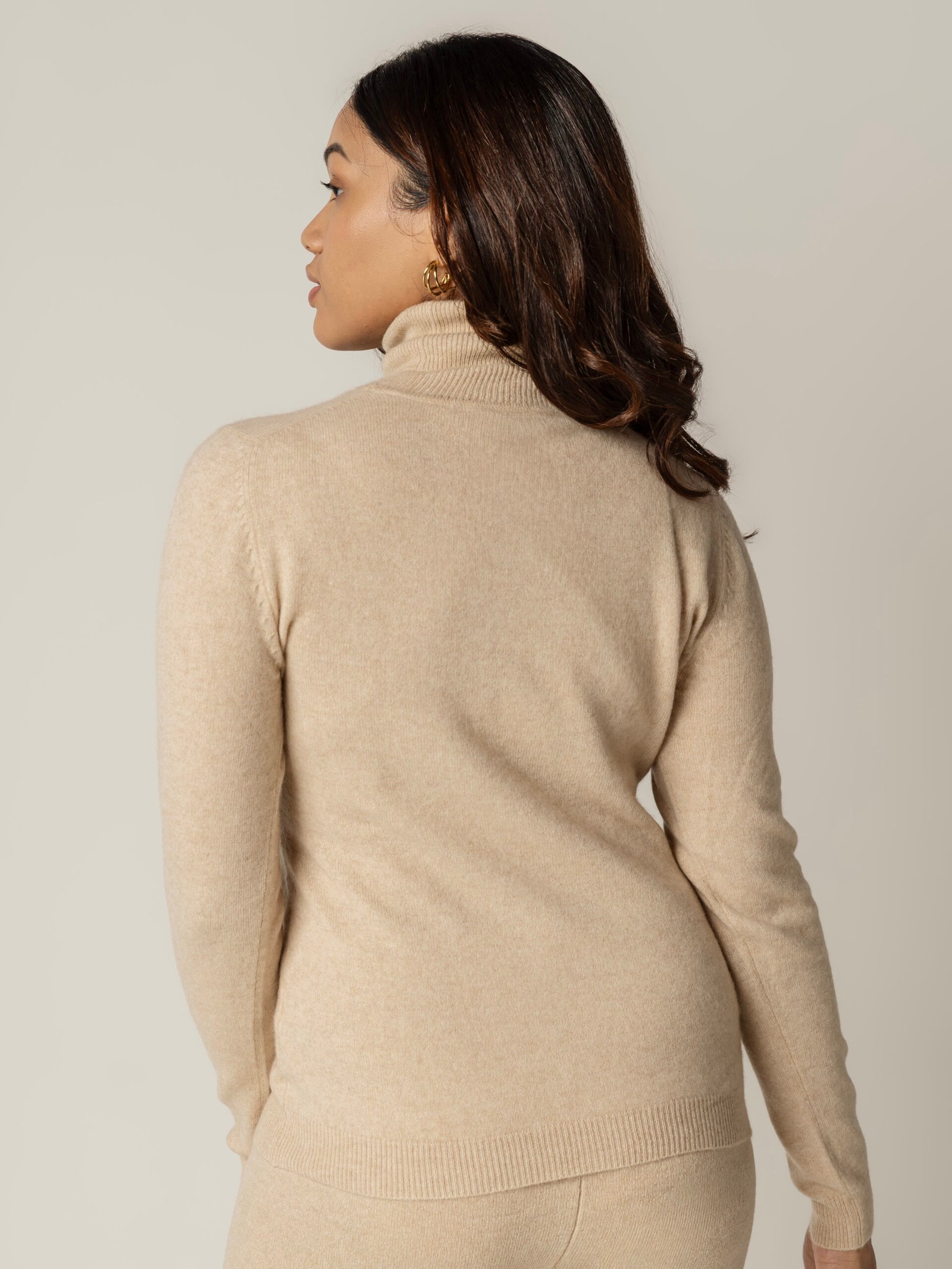 Stay warm and fashionable with this beige knit turtleneck sweater. Crafted from 100% A-grade Mongolian cashmere, this sweater combines luxurious softness with an elegant silhouette, making it the ideal companion for chilly days.